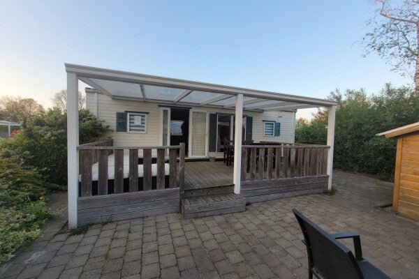 buiten de caravan is een overdekt terras met loungebank en eettafel en stoelen.