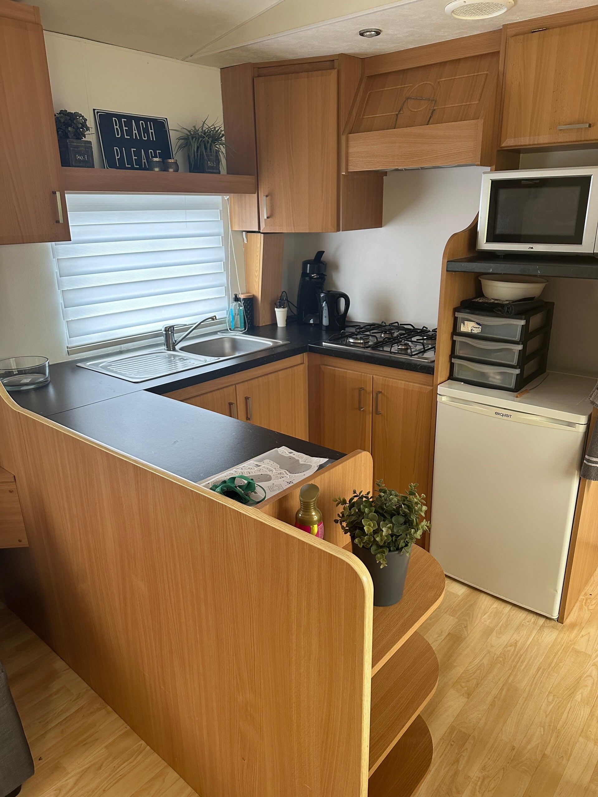 in de woonkamer is een keukenblok met koelkast en vriesvak en combi-oven.