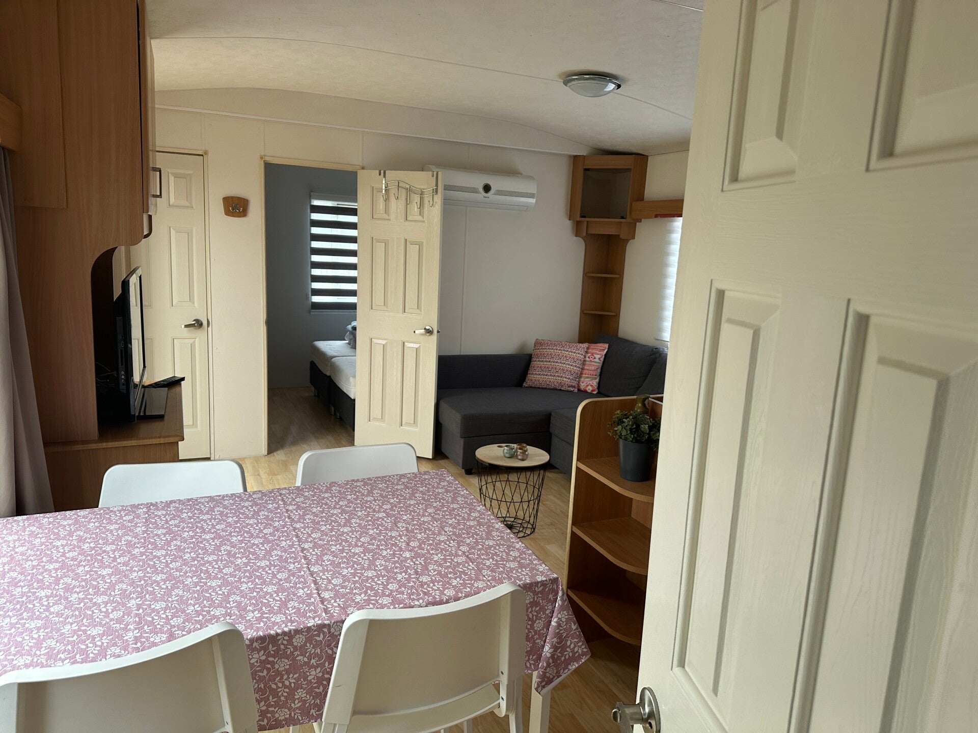 een eettafel en zithoek met slaapbank is ook in de slaapkamer. Hier kan 1 volwassene of 2 kinderen op slapen.
